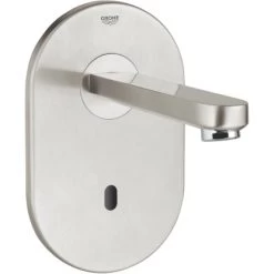 Die Grohe Infrarot-Elektronik für Ihren Waschtisch-Wandarmatur Eurosmart CE besitzt einen Infrarot-Sensor für bidirektionale Kommunikation für kaltes oder vorgemischtes Wasser. Sie besitzt einen Trafo 100-230 V AC, 50-60 Hz, 6 V DC. Die Armatur wird umrandet von einer Edelstahl-Rosette. Der hochwertige Edelstahl-Auslauf misst 17,2 cm.