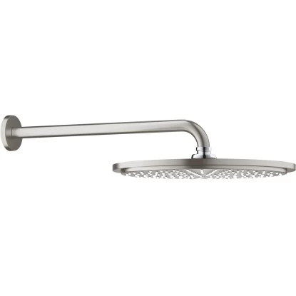 Die Grohe Rainshower Cosmopolitan 310 Kopfbrause-Set in der Farbvariante Supersteel verfügt über einen 380 mm großen Arm.