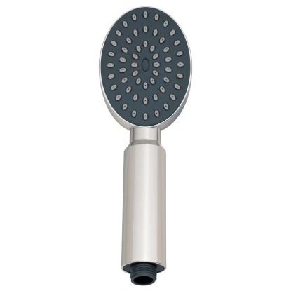 Die Handbrause hat eine ovale Form und eine einfache Funktion. Der Artikel ist aus Kunststoff und hat eine verchromte Oberfläche und eine anthrazitfarbene Innenfläche.