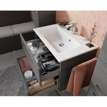 Als wandelbarer Allrounder und im kubischen Stil gestaltet, ist diese Badmöbelserie ein wahrer Bestseller. Die klare Formensprache bestimmt das zeitgemäße Design des Kundenlieblings. Das pflegeleichte Mineralmarmorwaschbecken mit seiner geradlinigen Form passt perfekt zum Waschbeckenunterschrank. Trentino passt sich jedem Ambiente mühelos an.