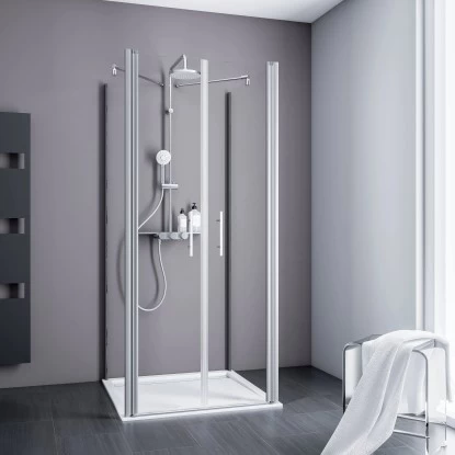 Die dezenten Aluminiumprofile sorgen zudem für eine hohe Stabilität der Duschkabine. Die praktischen Pendeltüren lassen sich dank des integrierten Heb-Senk-Mechanismus zuverlässig öffnen und schließen.